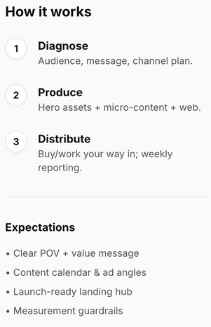 Paid + owned distribution with guardrails (MER, CAC, watch-through). We plan, buy, and learn weekly.